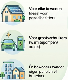 - Huiseigenaren met zonnepanelen - Zij kunnen hun surplus aan zonnestroom lokaal laten gebruiken, bijvoorbeeld als ze zelf niet thuis zijn.